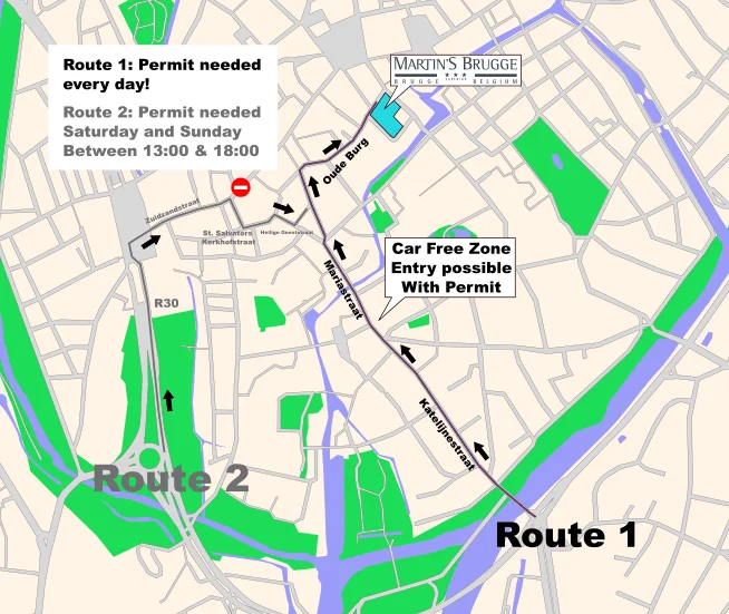 Von Montag bis Freitag empfehlen wir Ihnen, die Zuidzandstraat zu nehmen und an der St.-Salvator-Kathedrale von Brügge abzubiegen, um das Hotel zu erreichen.