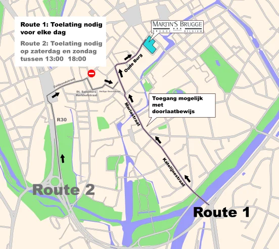 Van maandag tot en met vrijdag raden we je aan de Zuidzandstraat te nemen en af te slaan bij de Sint-Salvatorskathedraal om het hotel te bereiken.