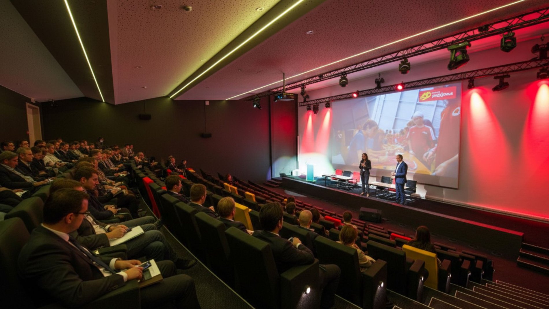 Een zwart-geel-rode seminariezaal in Waals-Brabant
